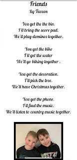 The students worked on writing four stanzas for their "Friends" poem using their ideas and graphic organizers from last week. After writing their sloppy copy, they edited their work and typed them on the chrome book for publishing.